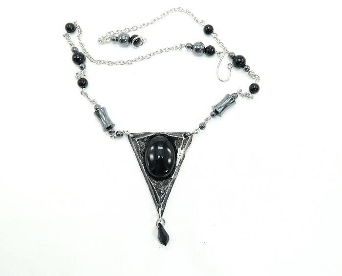 Unveil the mystique of the Black Onyx Triad Necklace, a captivating piece that embodies elegance and strength. The pendant is made of solid, lead-free pewter and weighs about .8 oz. The weight of this necklace is tangible and may have a comforting grounding effect for some. The chain is complete with black onyx beads to match the beautiful setting.