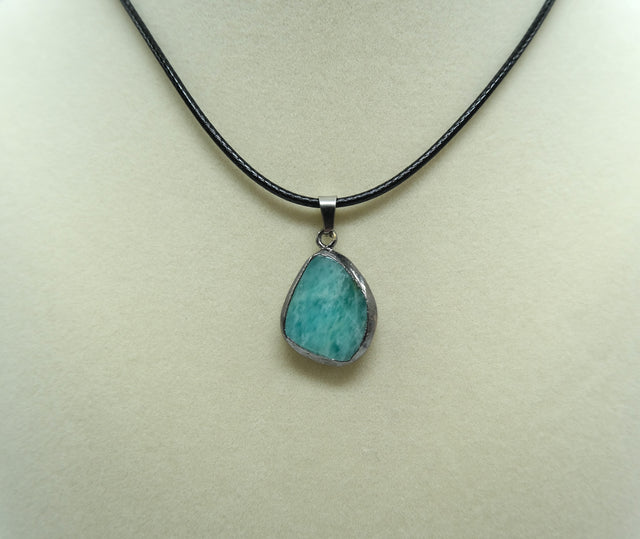 Each pendant is handcrafted with care, featuring a striking amazonite stone known for its soothing hues of turquoise and green, accented with a luxurious touch of black gold leaf.