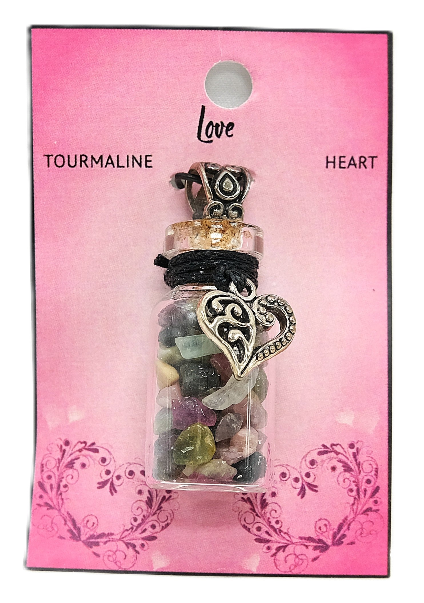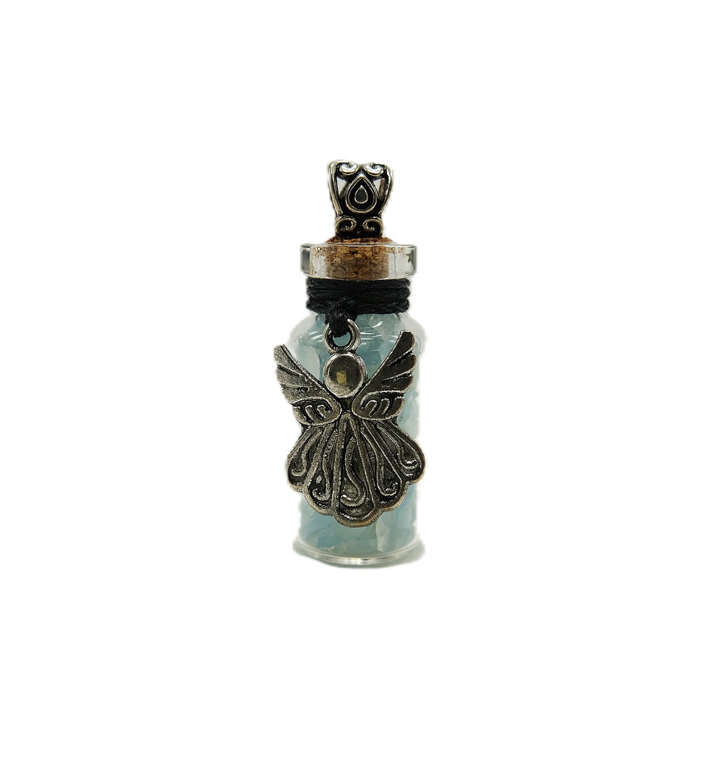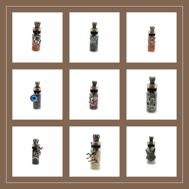 Miniature Glass Bottle Pendant: Sealed with love and intention, filled with crystal chips and adorned with a pendant.