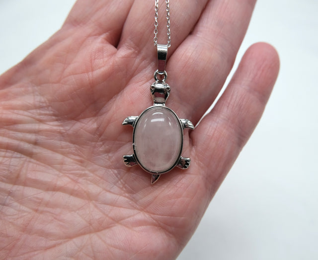 Suspended on a 16-inch necklace that shines with the luster of rhodium plating for added durability and shine, this pendant is a versatile addition to any jewelry collection. Whether dressed up for a special occasion or worn as a daily touch of elegance, the Rose Quartz Turtle Pendant is sure to captivate and enchant.